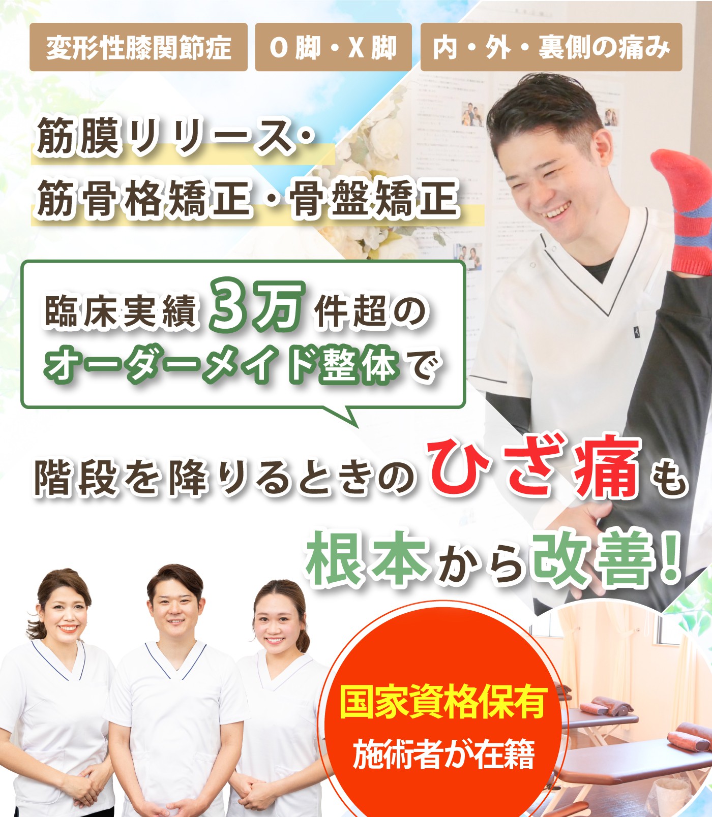 変形性膝関節症、半月板損傷、膝軟骨のすり減り、膝に水が溜まるなど膝の痛みの施術経験が豊富な整体院です。施術して終わりではなく、その後の自宅でできるセルフストレッチや生活習慣の指導もいたします。